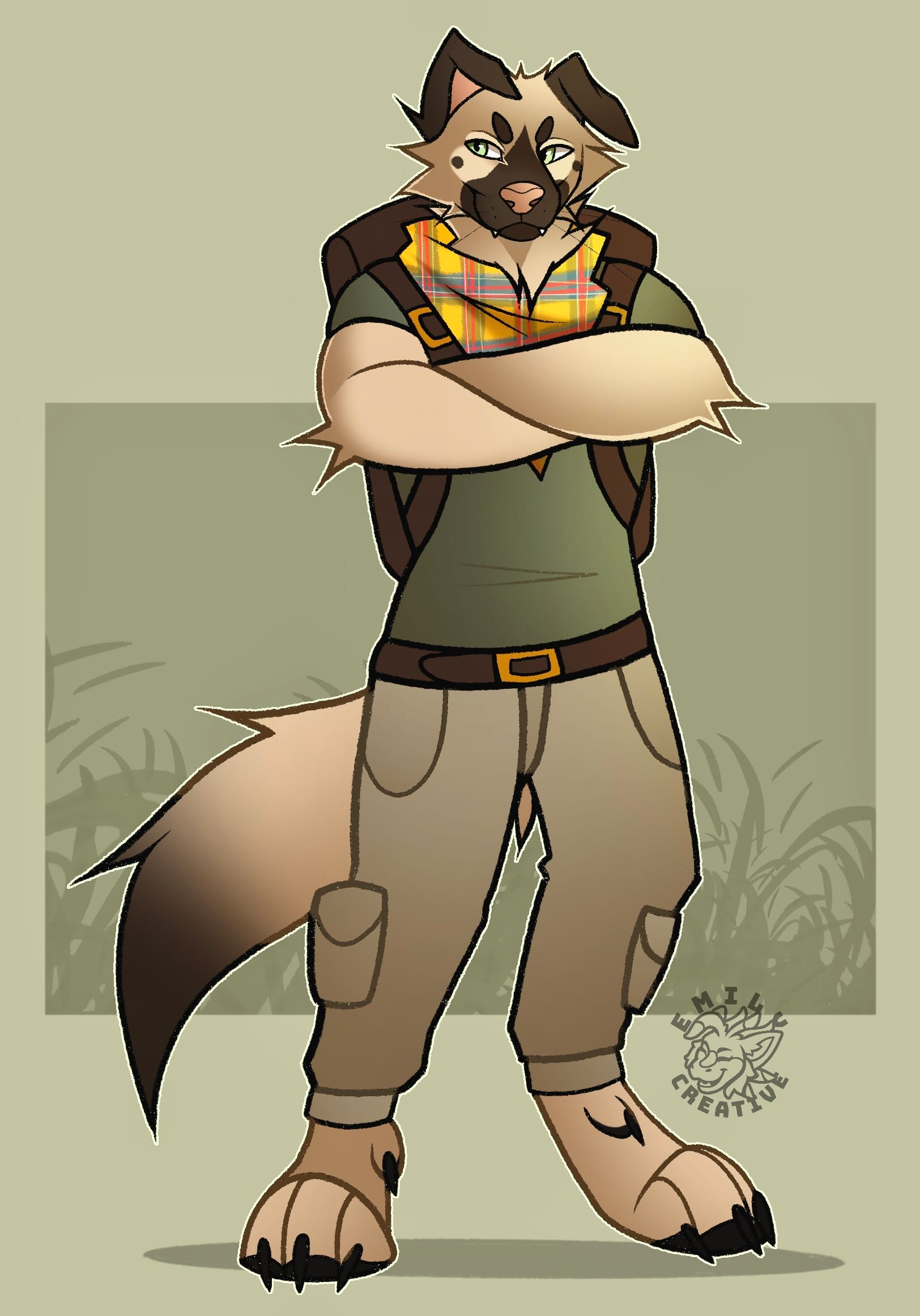 The artist is EmilyCreative and I love her designs so much (note the dewclaws :3)! He's a backpacker who loves the outdoors. He's loyal to his friends and tough on his enemies. His bandanna is inspired by the tartan one I use in videos sometimes! And yes, he is inspired by the Garrus Vakarian.